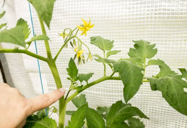 Tomato plants remove excess leaves and sucker stems that form along the main stem so that they grow as single-stemmed plants.