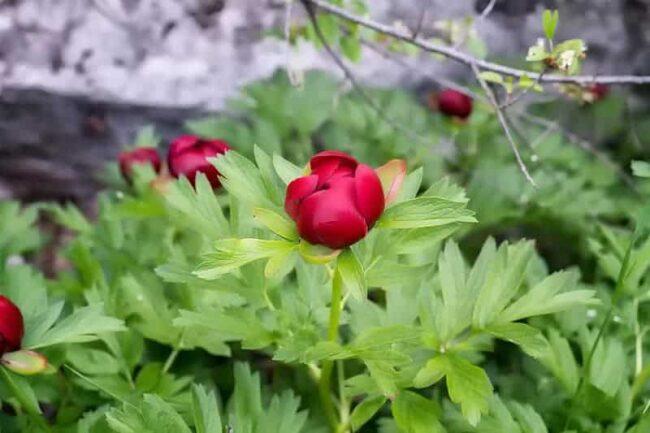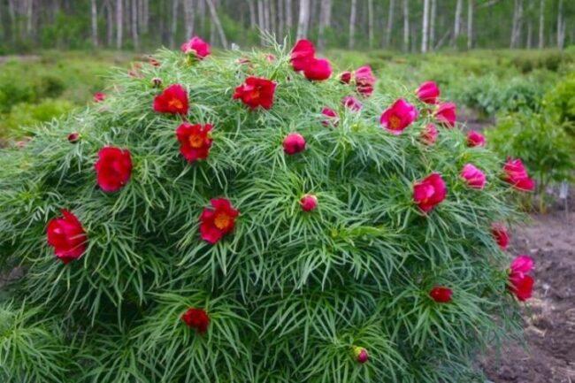 Delicate peony is a variety characterized by delicate feathery leaves and bright red flowers. A short peony, called “dill” because of its delicate leaves. It is a decorative species valued for its sophistication and unique beauty. This species blooms from April.