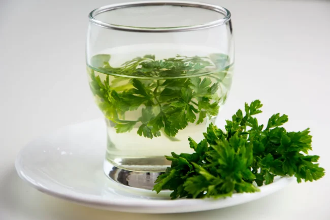 Ретельно промивають пучок петрушки, подрібнюють та злагоджують у банку. Потім заливають все теплою кип’яченою водою так, щоб вона покрила подрібнену суміш. Поставити банку холодильник і залишити на 24 години. Потім проціджують, щоб отримати лише воду, багату на вітаміни і мінерали.